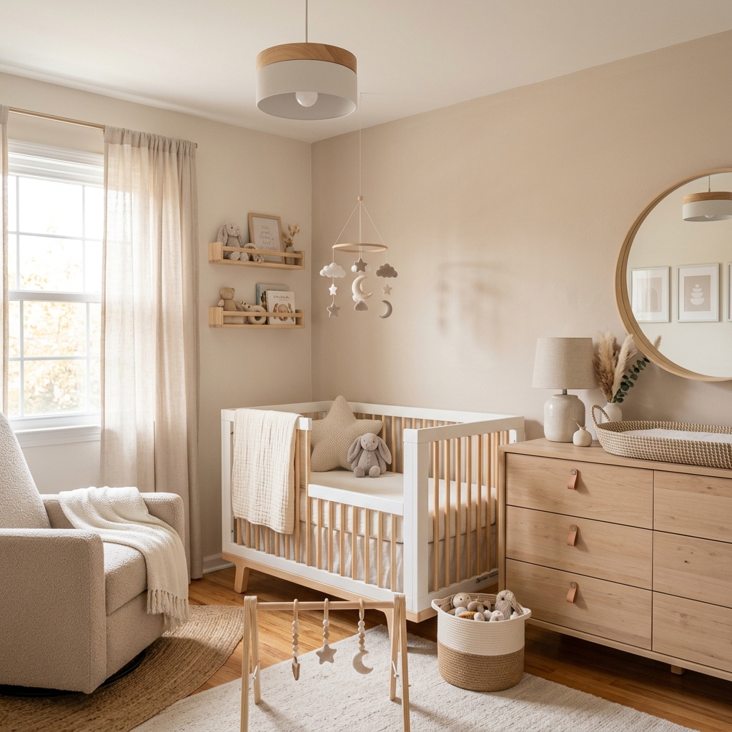 Cores neutras (areia, fendi, cinza quente) ajudam na regulação do sono biológico do bebê por não estimularem o cérebro em rítmo acelerado.
